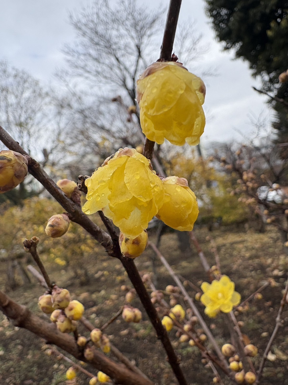 雨粒とロウバイです☔しっとりとした花姿です😊