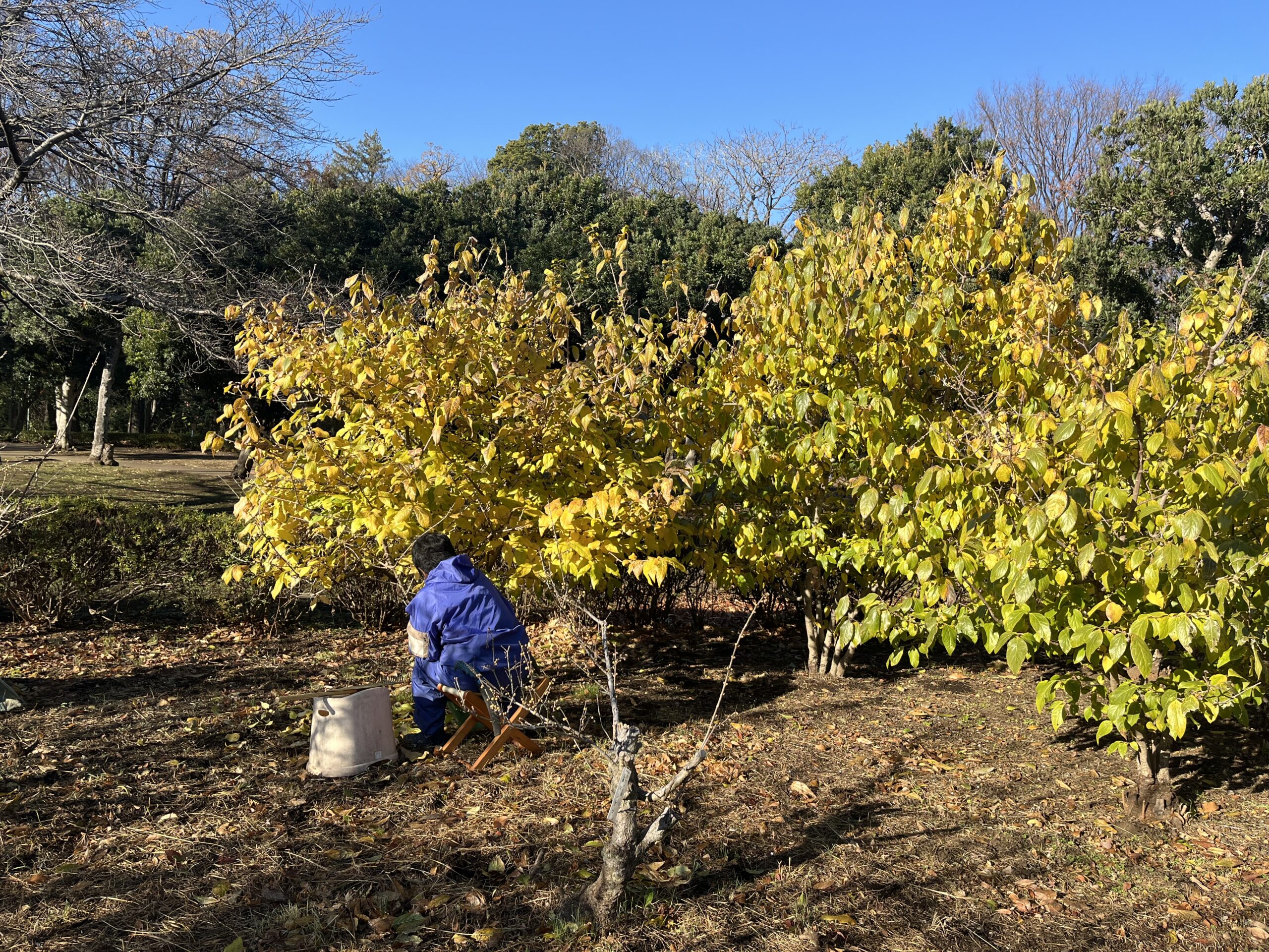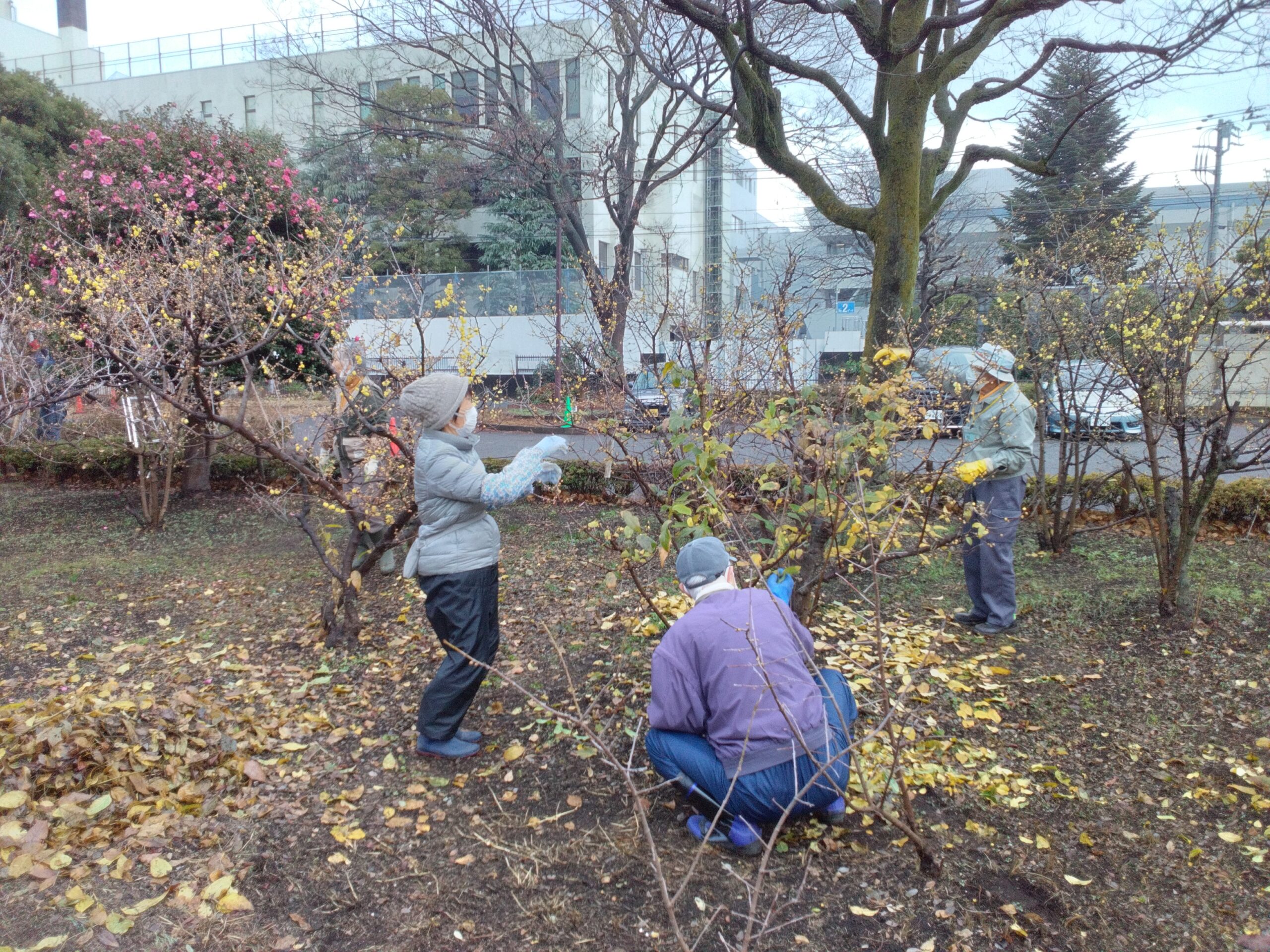 忠生公園では、ロウバイの花を存分に楽しんでいただくため、毎年年末までにボランティアのみなさんと職員が葉取り作業を完了させています。