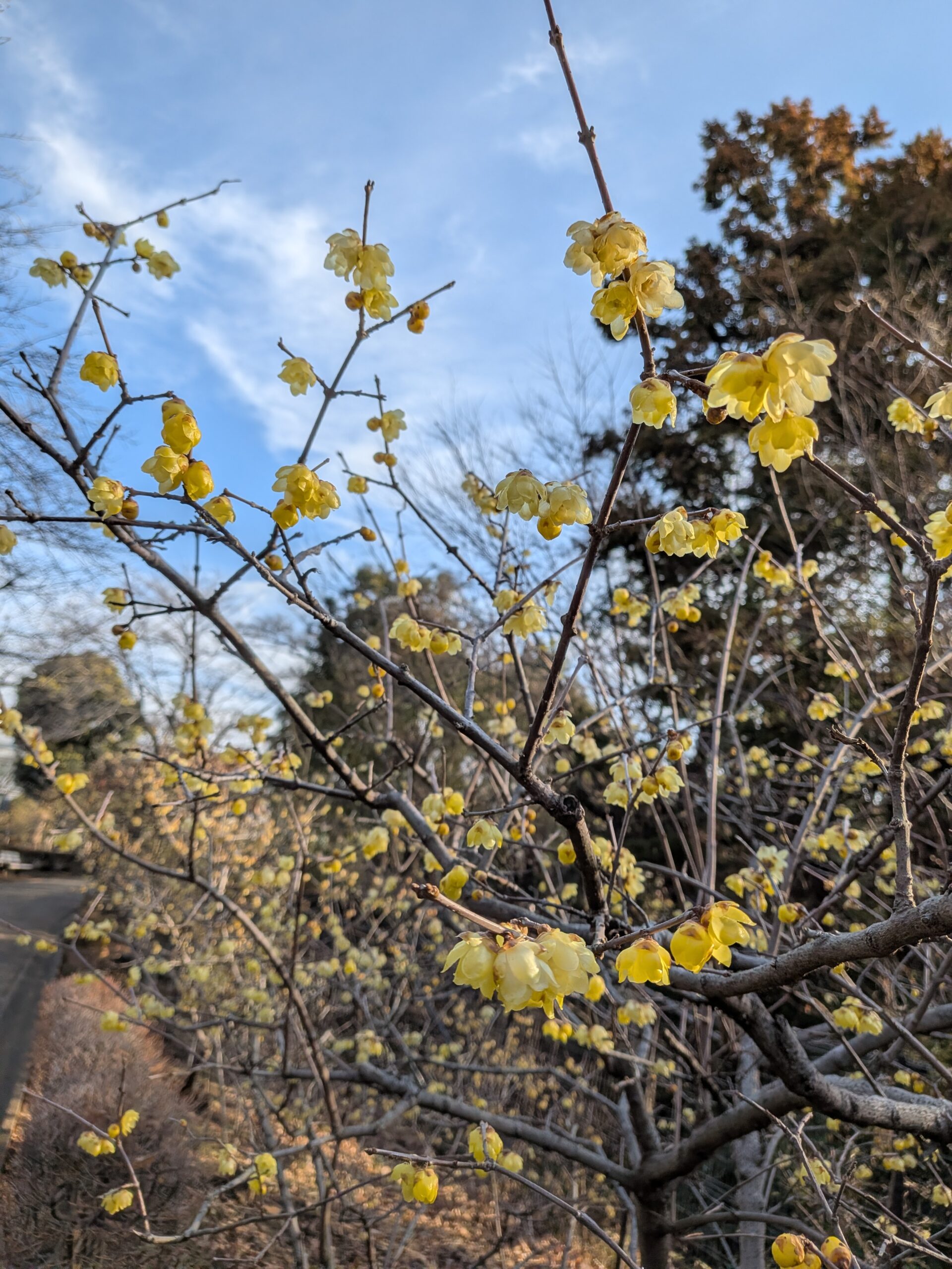 本日の蝋梅開花状況㉜ 2026年02月06日 レモン色のソシンロウバイが園路沿いにたくさん咲いています🌸 つぼみもありますのでもう少しの期間皆さまに楽しんでいただけます 園路沿いには濃黄色と赤褐色のマンサクも見ごろとなっています。
