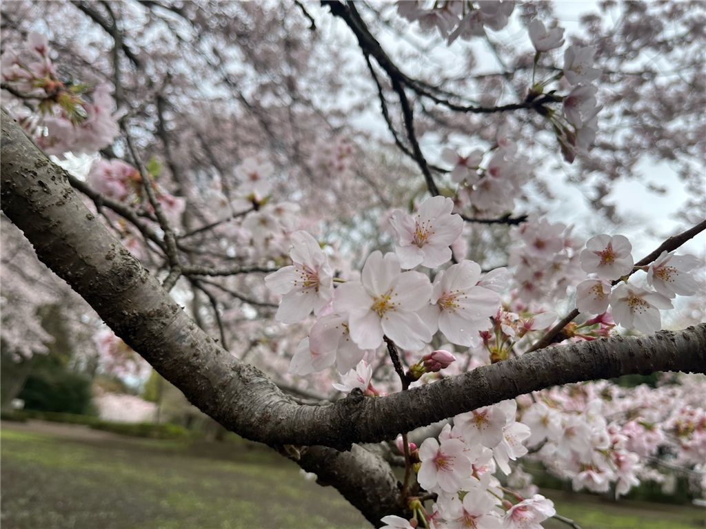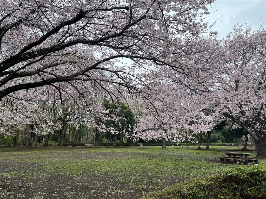 サクラ開花状況⑥ 2026年03月31日 忠生公園 花びらが、ひらひらと舞いはじめ地面がピンク色に染まってきました🌸 雨上がりの為、地面が大変滑りやすいです☔ ご来園の際にはお気をつけて園内をお楽しみください😊