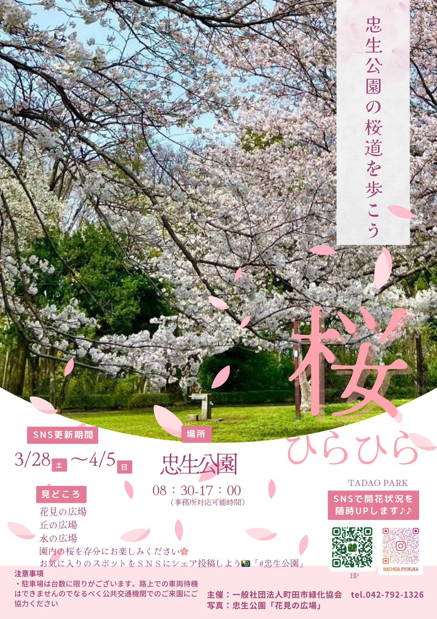 忠生公園の桜道を歩こう🌸 2026年01月20日 忠生公園は春の時期、桜の花が咲きます🌸 園内の「花見の広場」「水の広場」「丘の広場」など、桜のスポットがいくつかあります! 園内の開花状況をHPの「ブログ」とInstagramのストーリーにてupしていきます!キッチンカーさんも出店予定ですので合わせてご確認ください🚗 ※駐車場の台数は数に限りがございます。満車の場合は路上待機ができません。なるべく公共交通機関でのご来園にご協力ください。ご理解のほどよろしくお願い申し上げます。 詳しくはHPのアクセスをご覧ください。