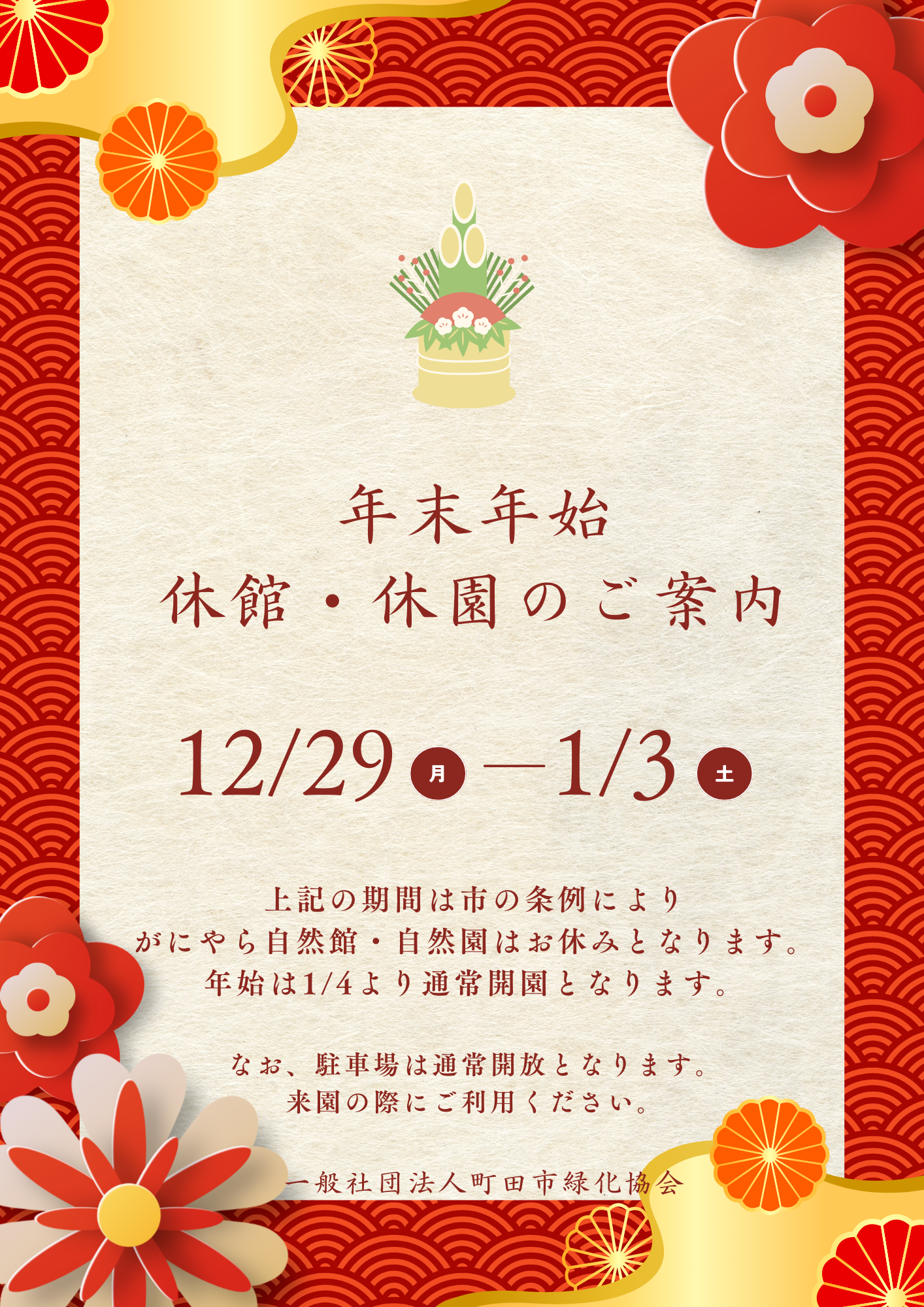 【年末年始】ご案内 2025年12月05日 忠生公園 2025.12.29(月)~2026.01.03(土)は自然園及びがにやら自然館は休園となります。 2026.01.04(土)より通常開園となります。